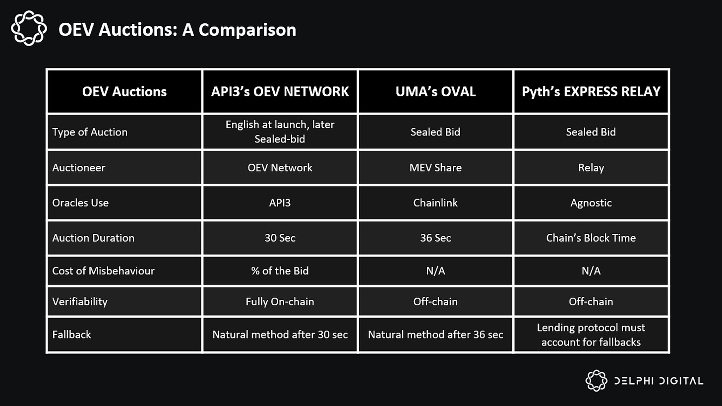通常 OEV 算是沒辦法避免,所以大部分 OEV Solution 都是嘗試去捕獲 Leak 的 OEV,而目前市面上 OEV Solution( API3、UMA 和 Pyth )都是透過拍賣機制(Order Flow Auction)去解決,透過競價機制去回收 OEV 來回饋給協議,下圖就是一個相當清楚得比較表供大家參考。
